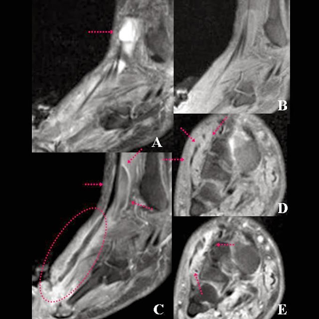 Los tendones no son una vía común de diseminación de las infecciones. De tal manera puede encontraste en la Resonancia un engrosamiento y acumulación de líquido en las vainas de los tendones. Luego de administrar agente de contraste las membranas sinoviales inflamadas suelen realzar en forma evidente.